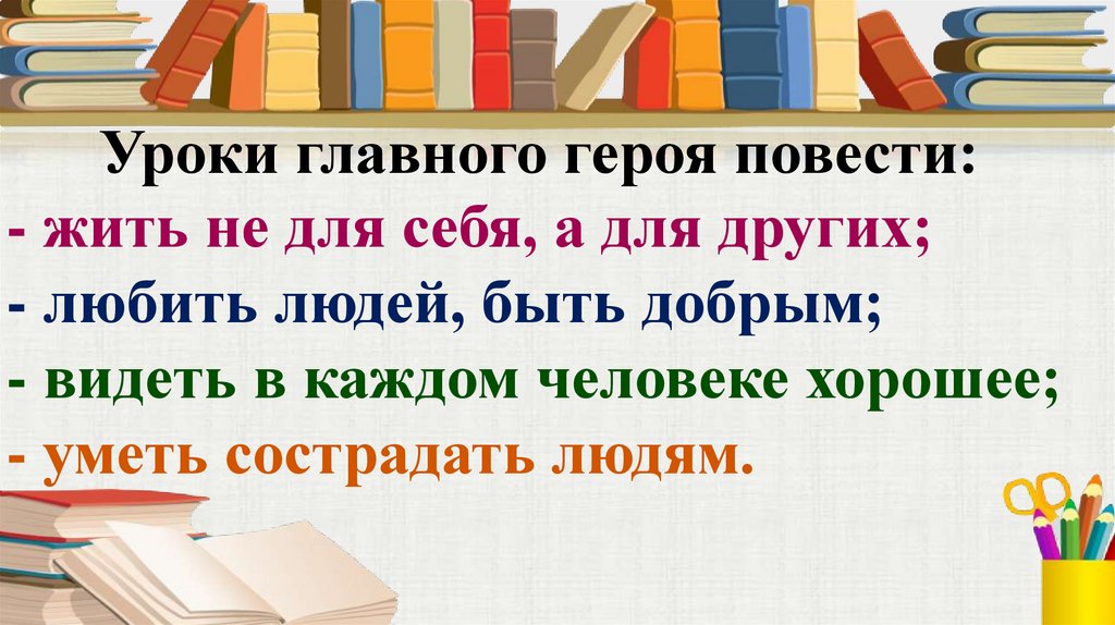 Уроки главного героя повести:- жить не для себя, а для других;