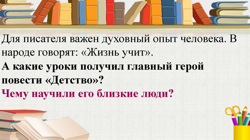 Для писателя важен духовный опыт человека. Внароде говорят: «Жизнь учит».