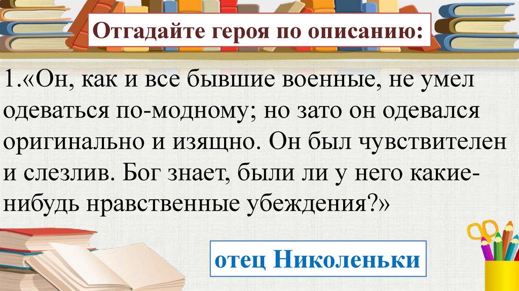 Отгадайте героя по описанию:1.«Он, как и все бывшие военные, не умел