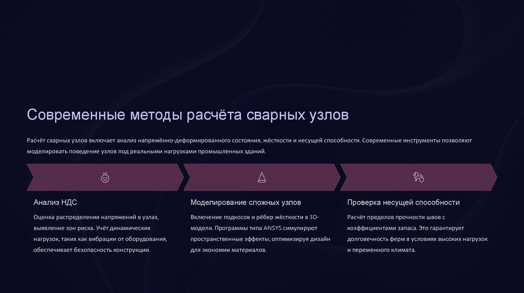 Современные методы расчёта сварных узловРасчёт сварных узлов включает анализ напряжённо-деформированного состояния, жёсткости и несущей способности. Современные инструменты позволяют