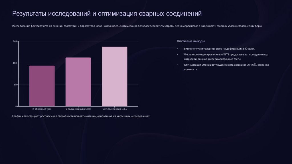 Результаты исследований и оптимизация сварных соединенийИсследования фокусируются на влиянии геометрии и параметров швов на прочность. Оптимизация позволяет сократить затраты без компромиссов в надёжности сварных узлов металлических ферм.