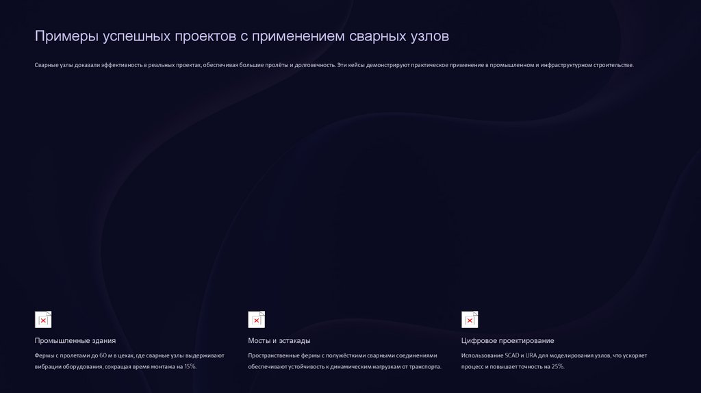 Примеры успешных проектов с применением сварных узловСварные узлы доказали эффективность в реальных проектах, обеспечивая большие пролёты и долговечность. Эти кейсы демонстрируют практическое применение в промышленном и инфраструктурном строительстве.