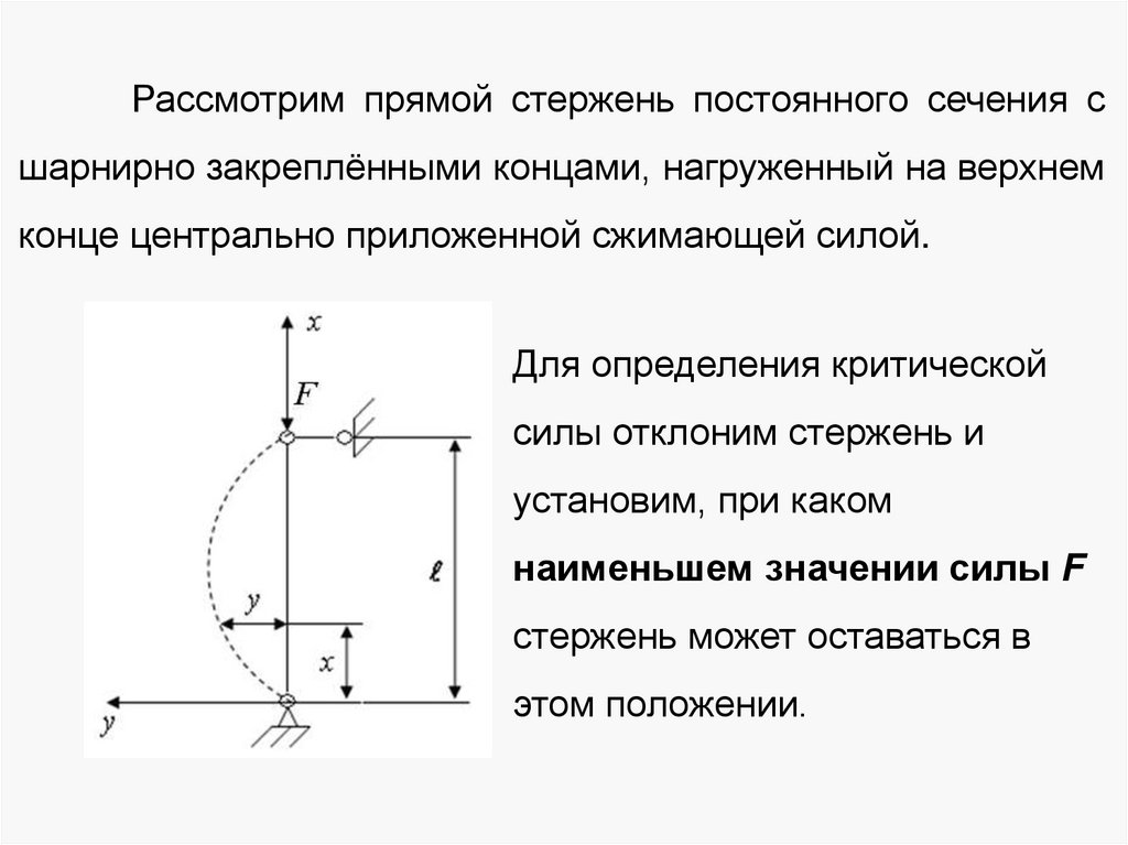 Рассмотрим прямой стержень постоянного сечения сшарнирно закреплёнными концами, нагруженный на верхнем