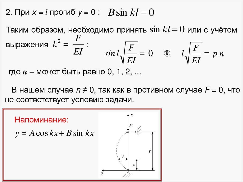 2. При x = l прогиб y = 0 :B sin kl 0
