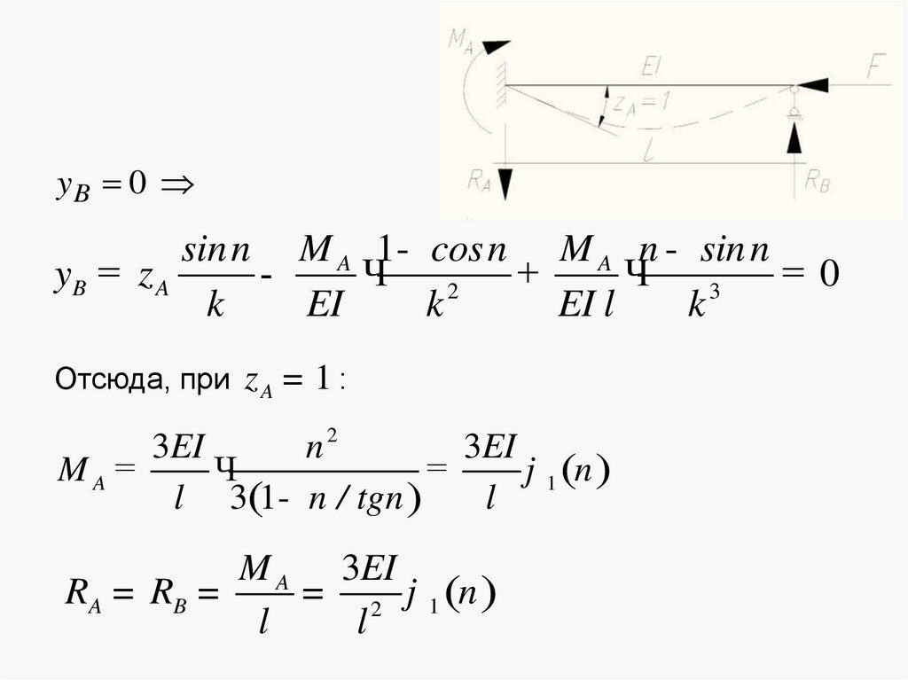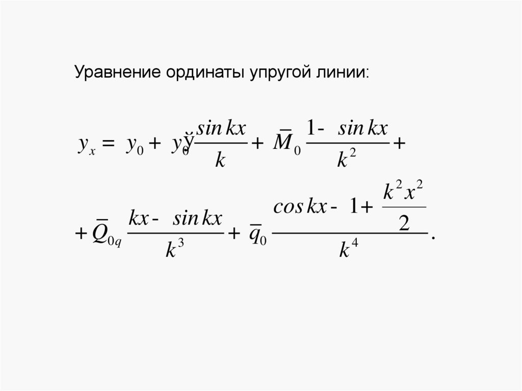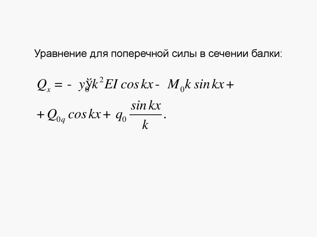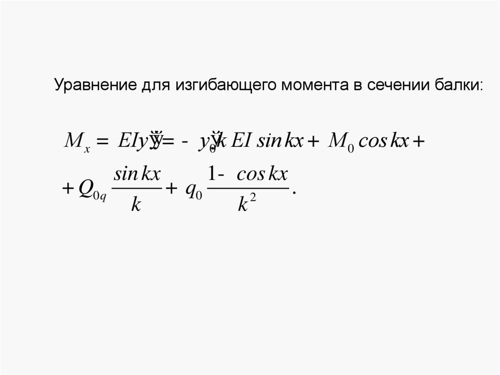Уравнение для изгибающего момента в сечении балки:М x = EIy ўў= - y0ўk EI sin kx + M 0 cos kx +