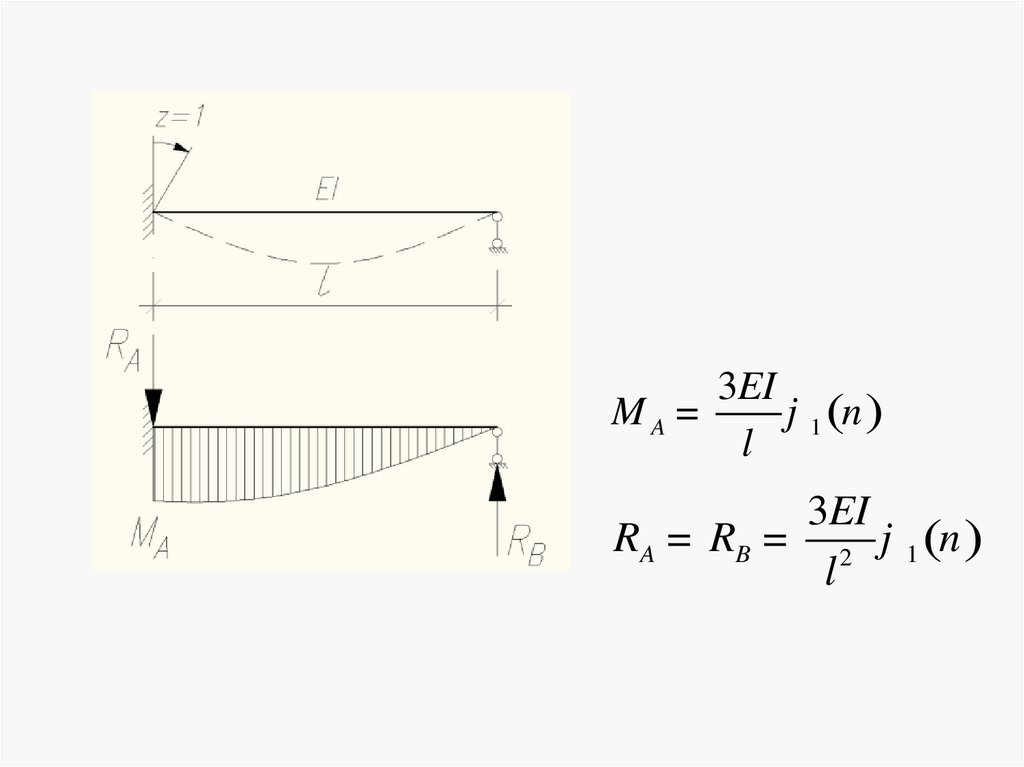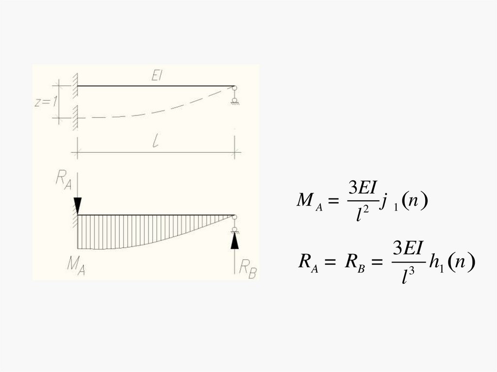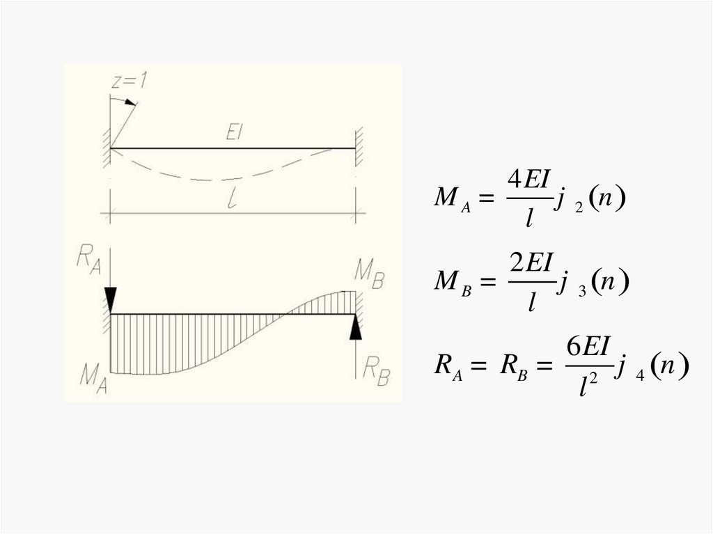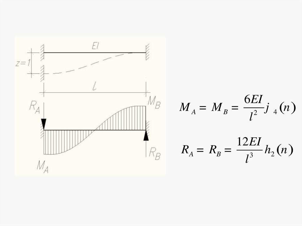 Уравнение для изгибающего момента в сечении балки:М x = EIy ўў= - y0ўk EI sin kx + M 0 cos kx +