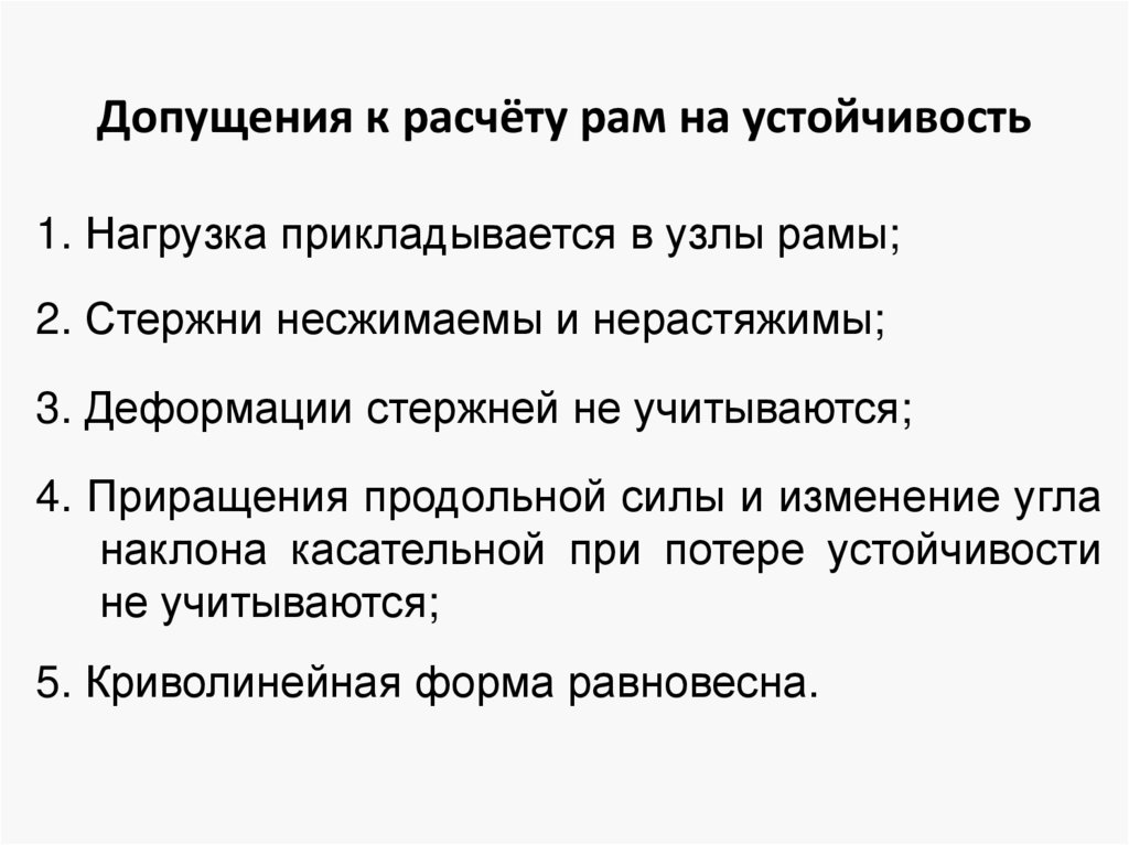 Допущения к расчёту рам на устойчивость1. Нагрузка прикладывается в узлы рамы;