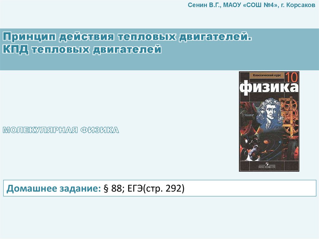 Сенин В.Г., МАОУ «СОШ №4», г. КорсаковПринцип действия тепловых двигателей.