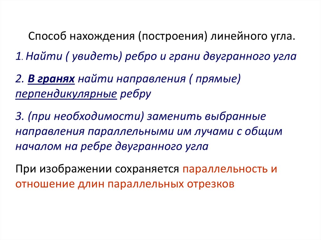 Способ нахождения (построения) линейного угла.1. Найти ( увидеть) ребро и грани двугранного угла