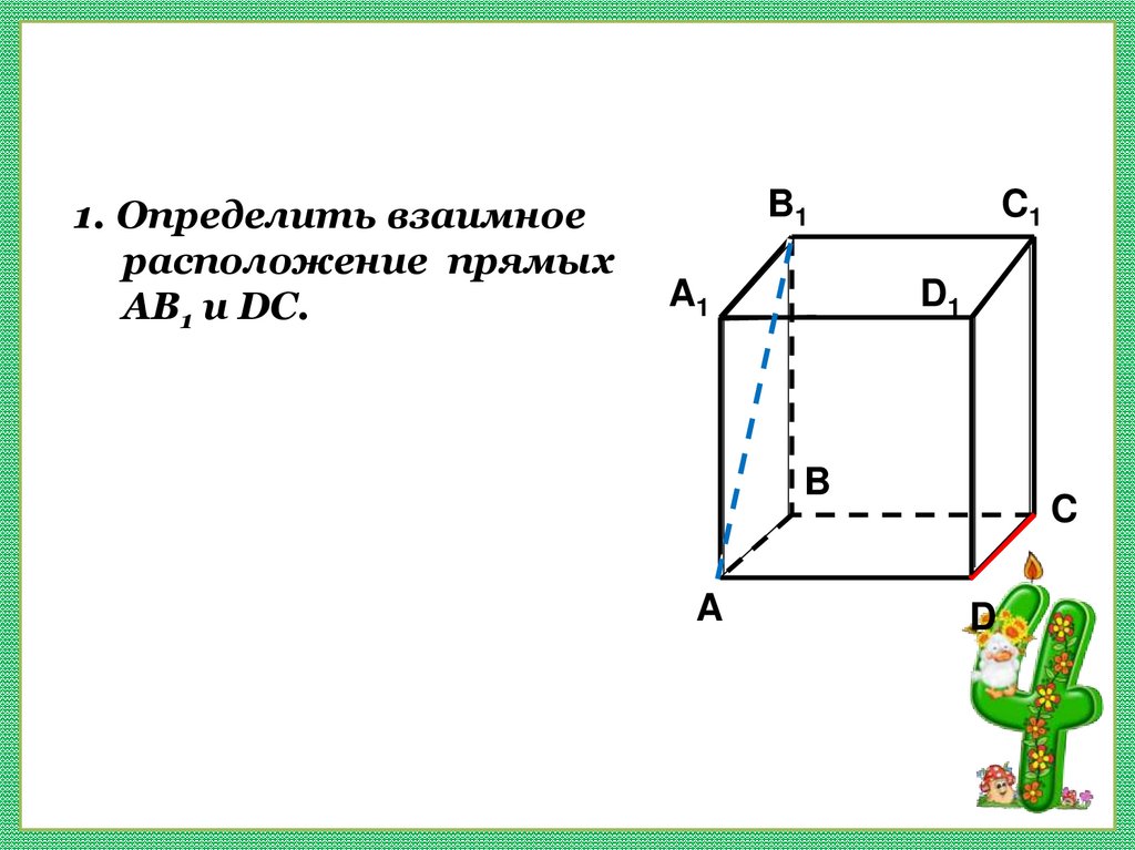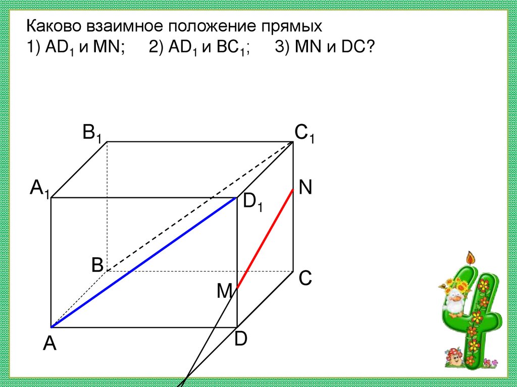 Каково взаимное положение прямых1) AD1 и МN; 2) AD1 и ВС1; 3) МN и DC?