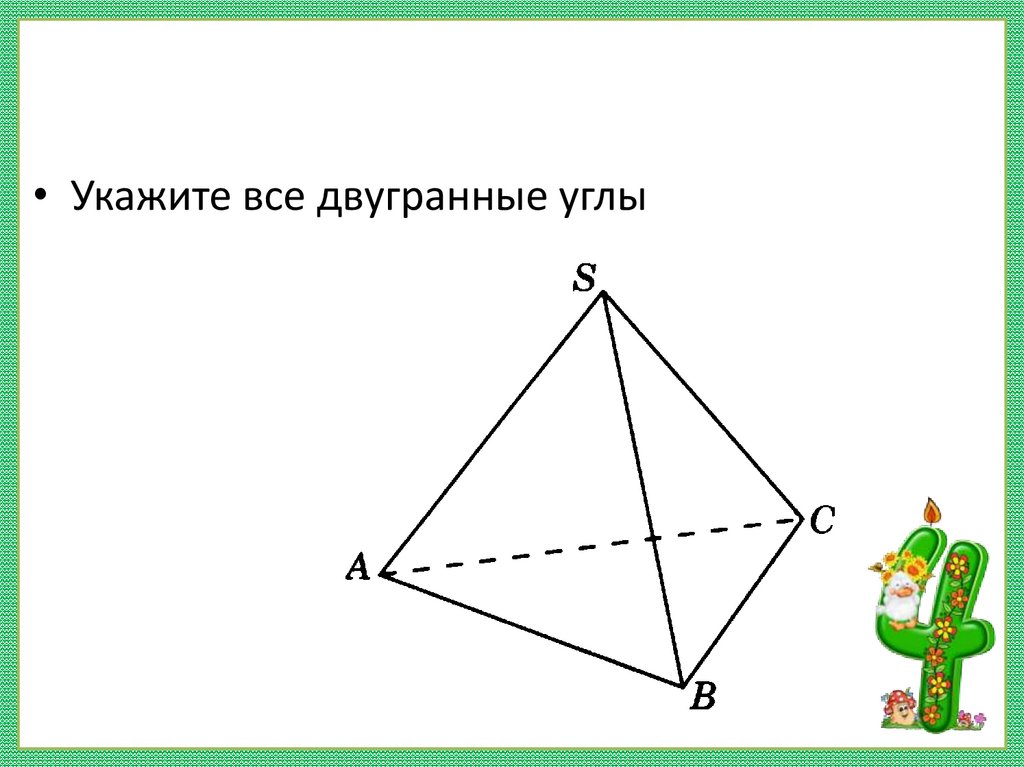 • Укажите все двугранные углы11. Примеры двугранных углов: