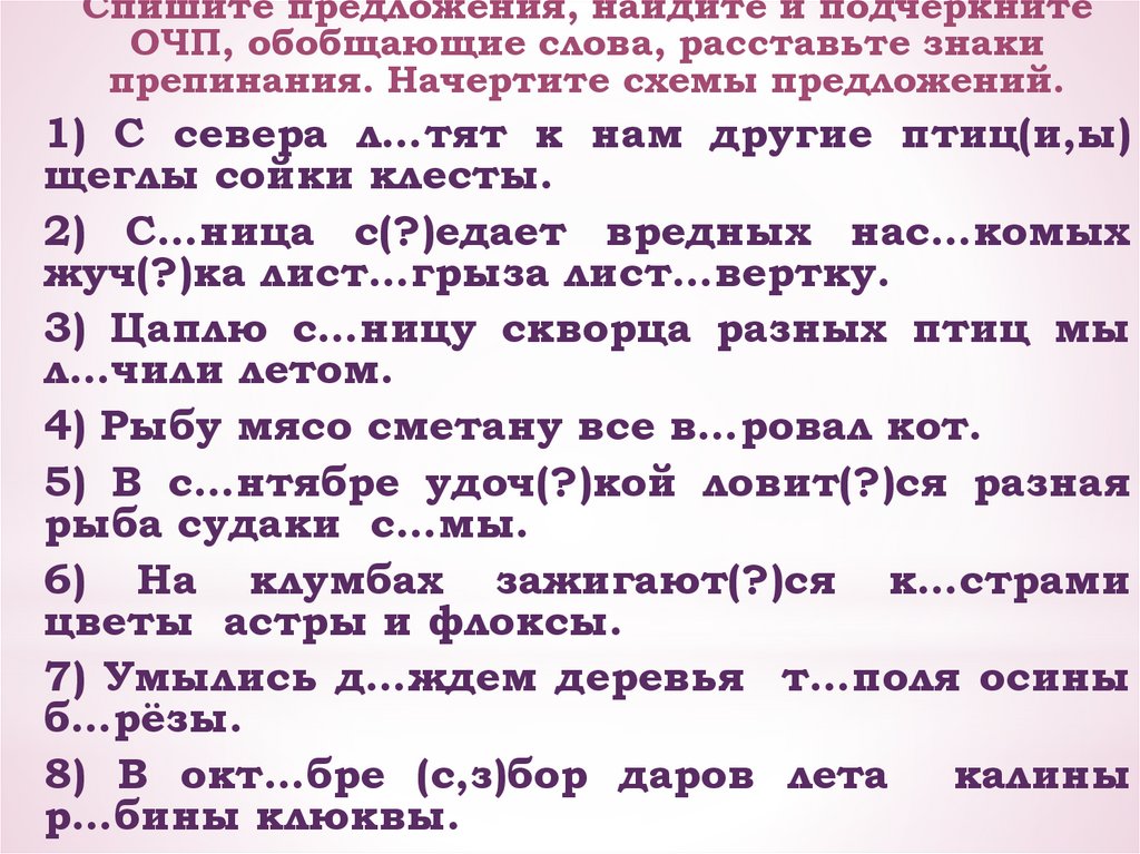 Спишите предложения, найдите и подчеркнитеОЧП, обобщающие слова, расставьте знаки