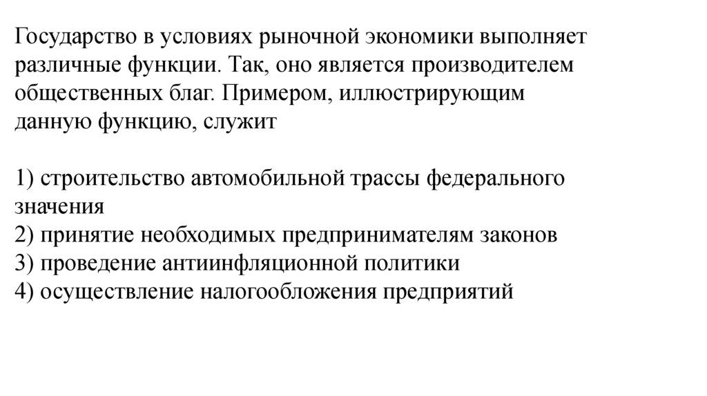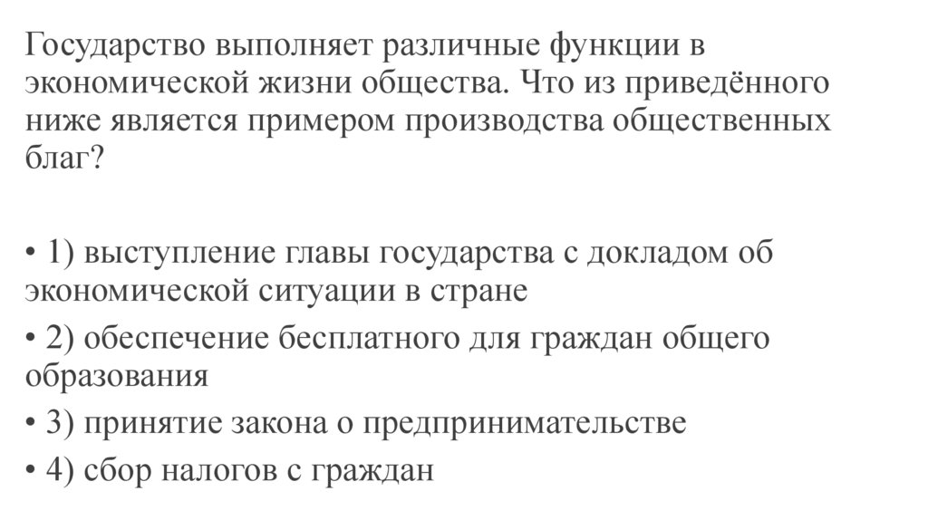 Государство выполняет различные функции в экономическойжизни общества. Одна из них - производство общественных