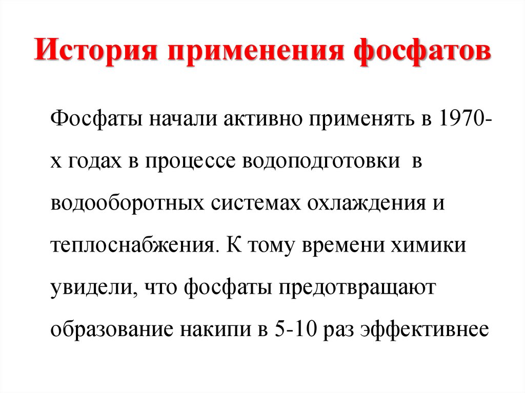 История применения фосфатовФосфаты начали активно применять в 1970х годах в процессе водоподготовки в