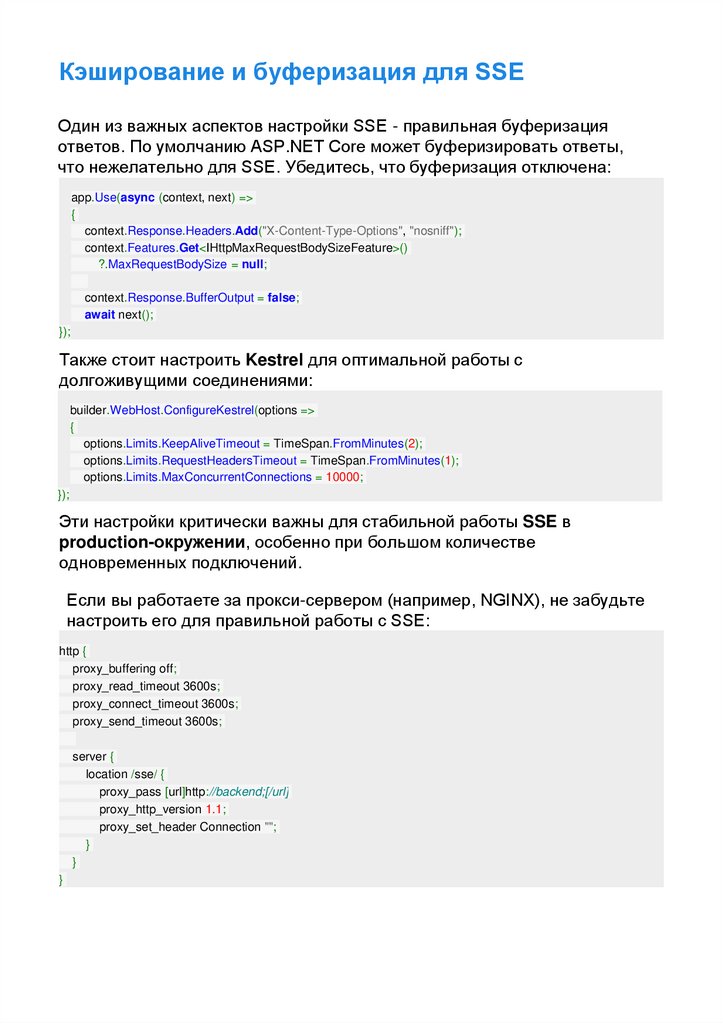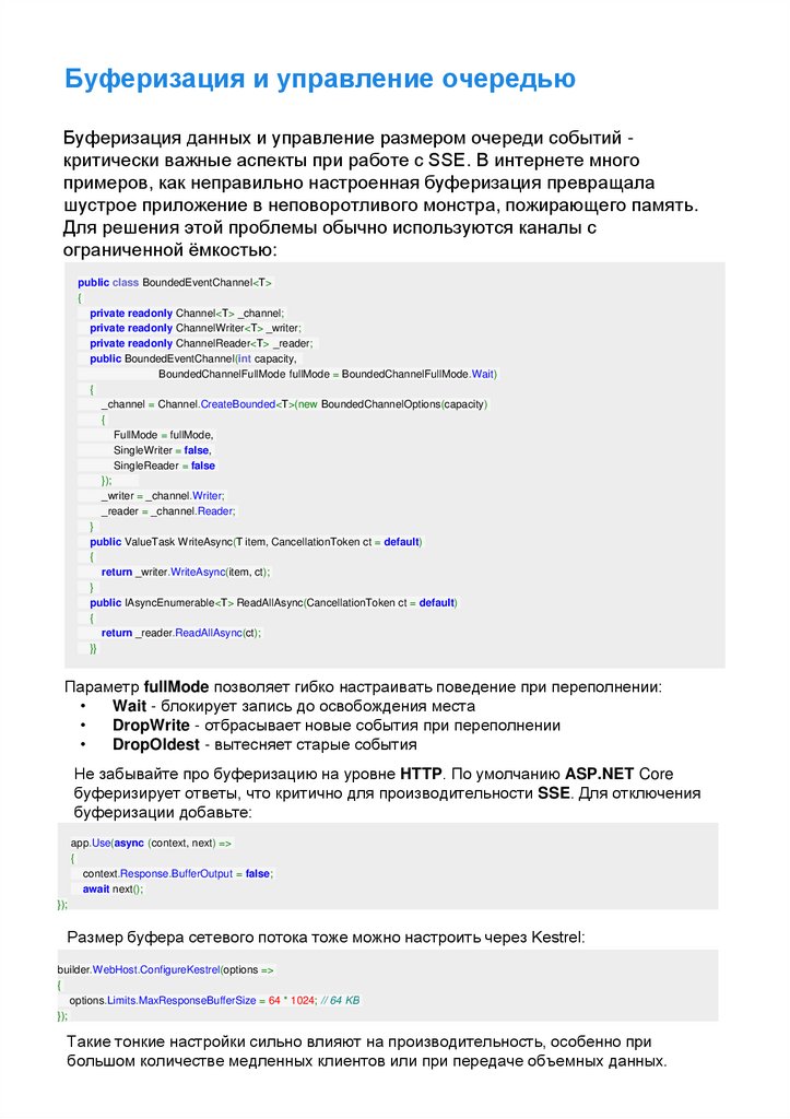 Буферизация и управление очередьюБуферизация данных и управление размером очереди событий критически важные аспекты при работе с SSE. В интернете много