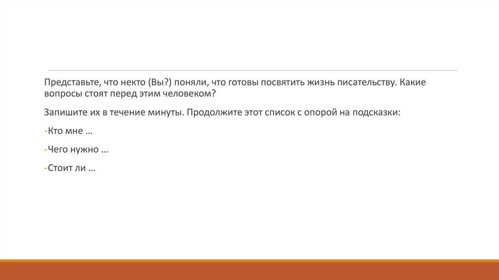 Представьте, что некто (Вы?) поняли, что готовы посвятить жизнь писательству. Какиевопросы стоят перед этим человеком?