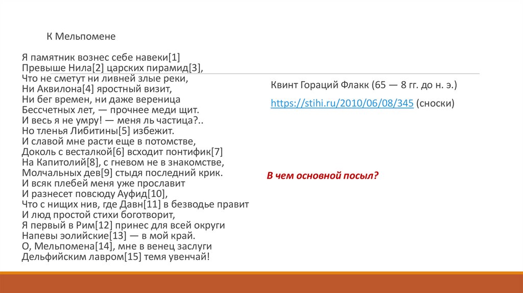 ? Почему при разговоре об этом стихотворении стоит вспомнить Горация (кто это?) иДержавина?
