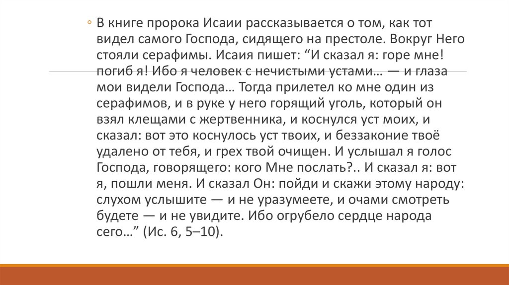 ◦ В книге пророка Исаии рассказывается о том, как тотвидел самого Господа, сидящего на престоле. Вокруг Него