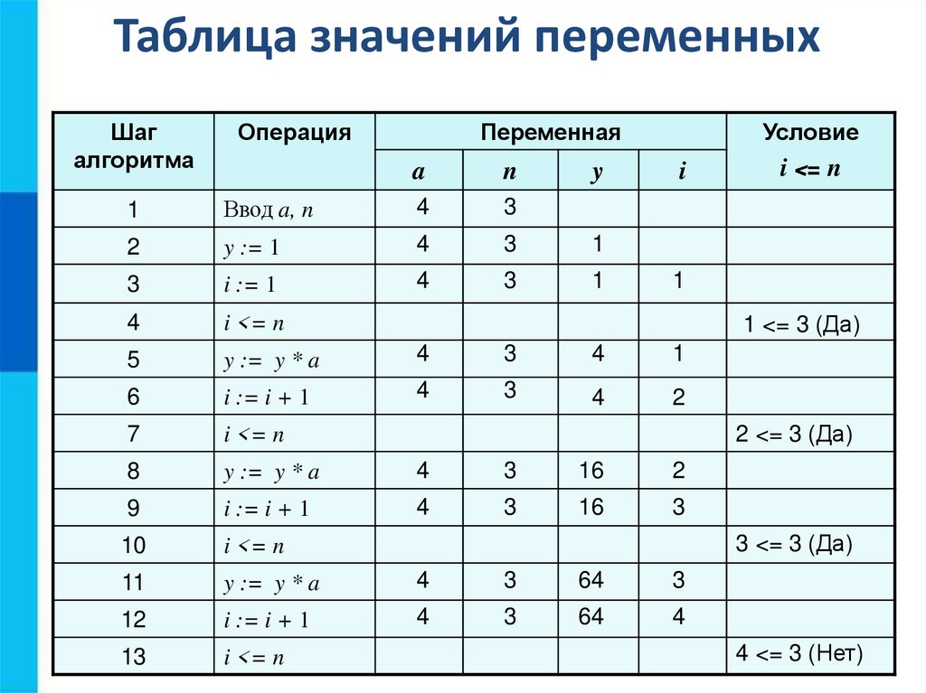Таблица значений переменныхШаг