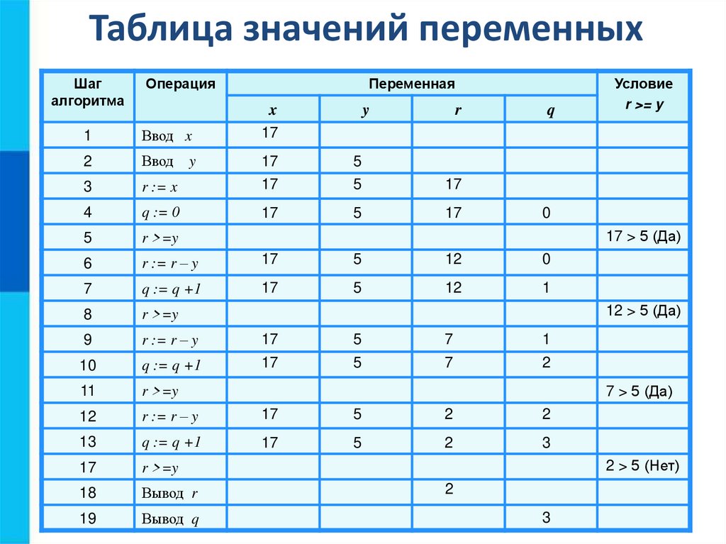 значений переменных,