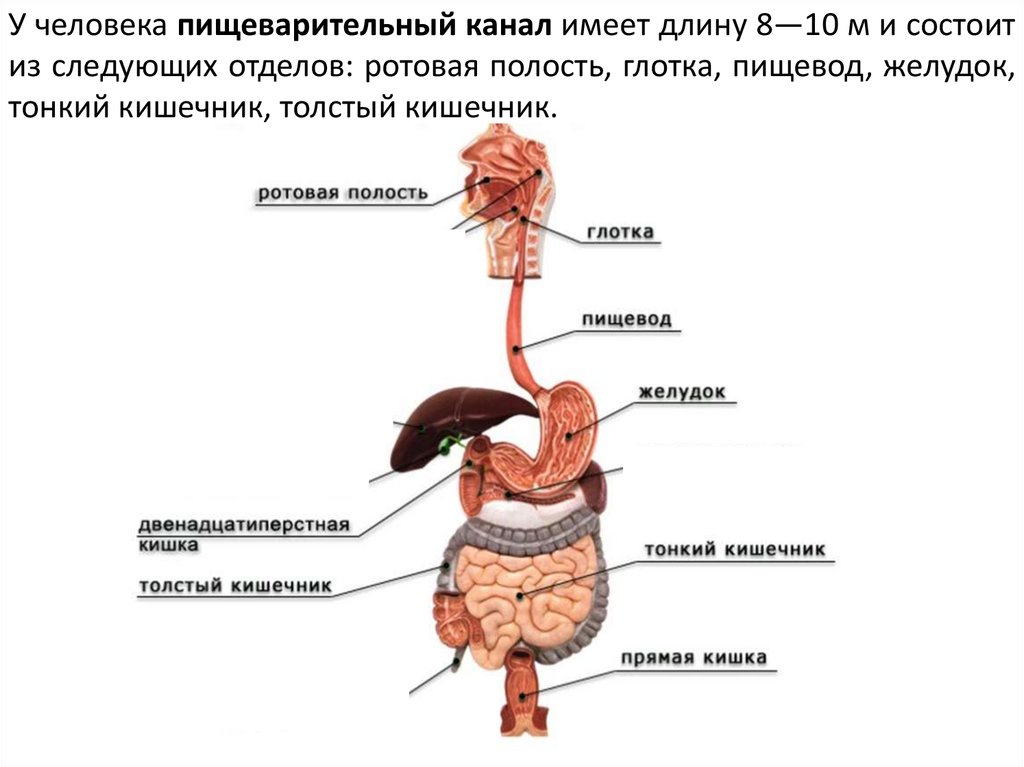 У человека пищеварительный канал имеет длину 8—10 м и состоитиз следующих отделов: ротовая полость, глотка, пищевод, желудок,