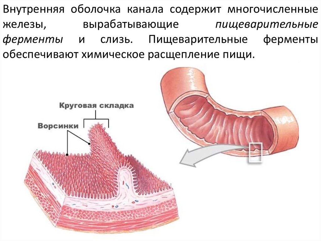 Внутренняя оболочка канала содержит многочисленныежелезы,