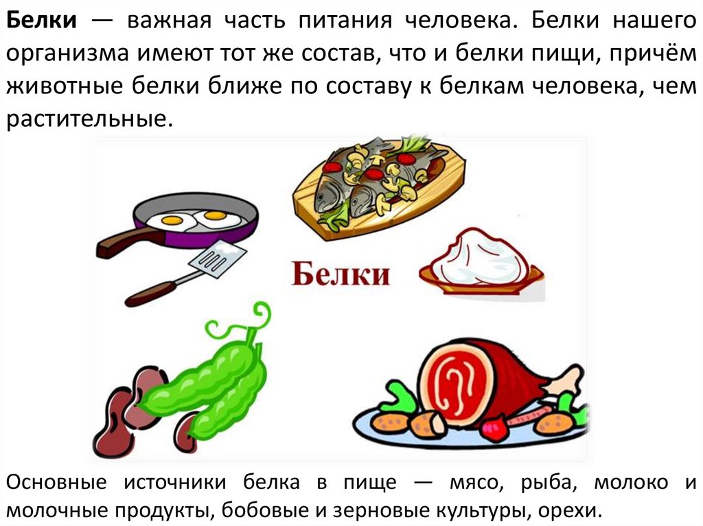 Белки — важная часть питания человека. Белки нашегоорганизма имеют тот же состав, что и белки пищи, причём