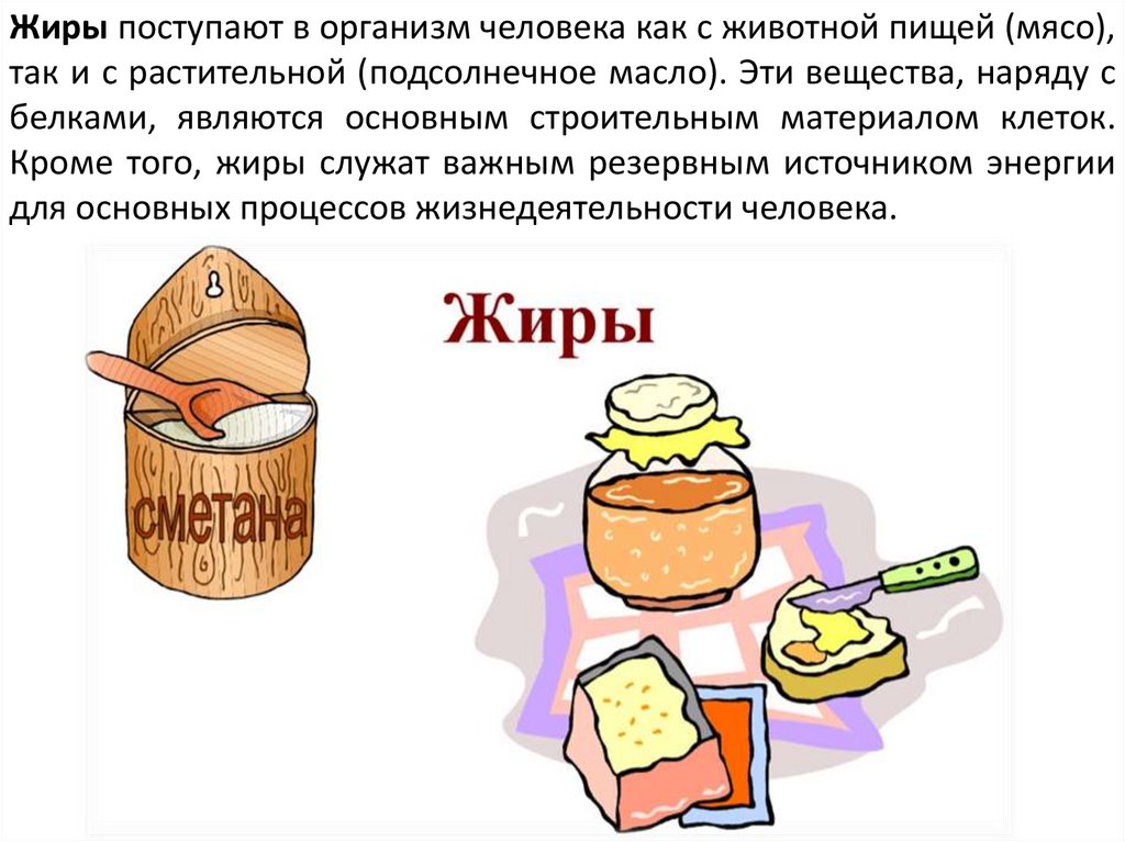 Жиры поступают в организм человека как с животной пищей (мясо),так и с растительной (подсолнечное масло). Эти вещества, наряду с