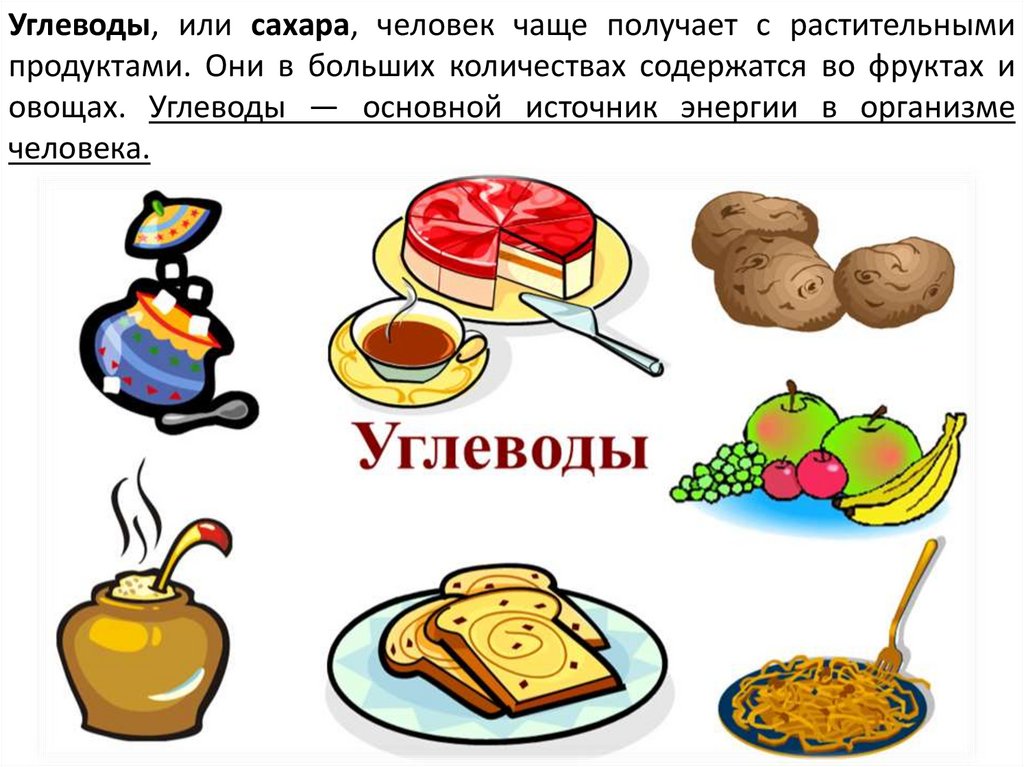 Углеводы, или сахара, человек чаще получает с растительнымипродуктами. Они в больших количествах содержатся во фруктах и