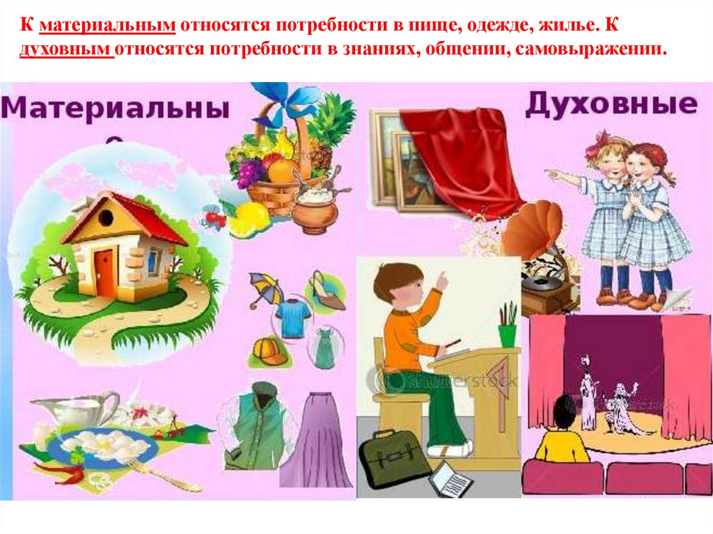 К материальным относятся потребности в пище, одежде, жилье. Кдуховным относятся потребности в знаниях, общении, самовыражении.