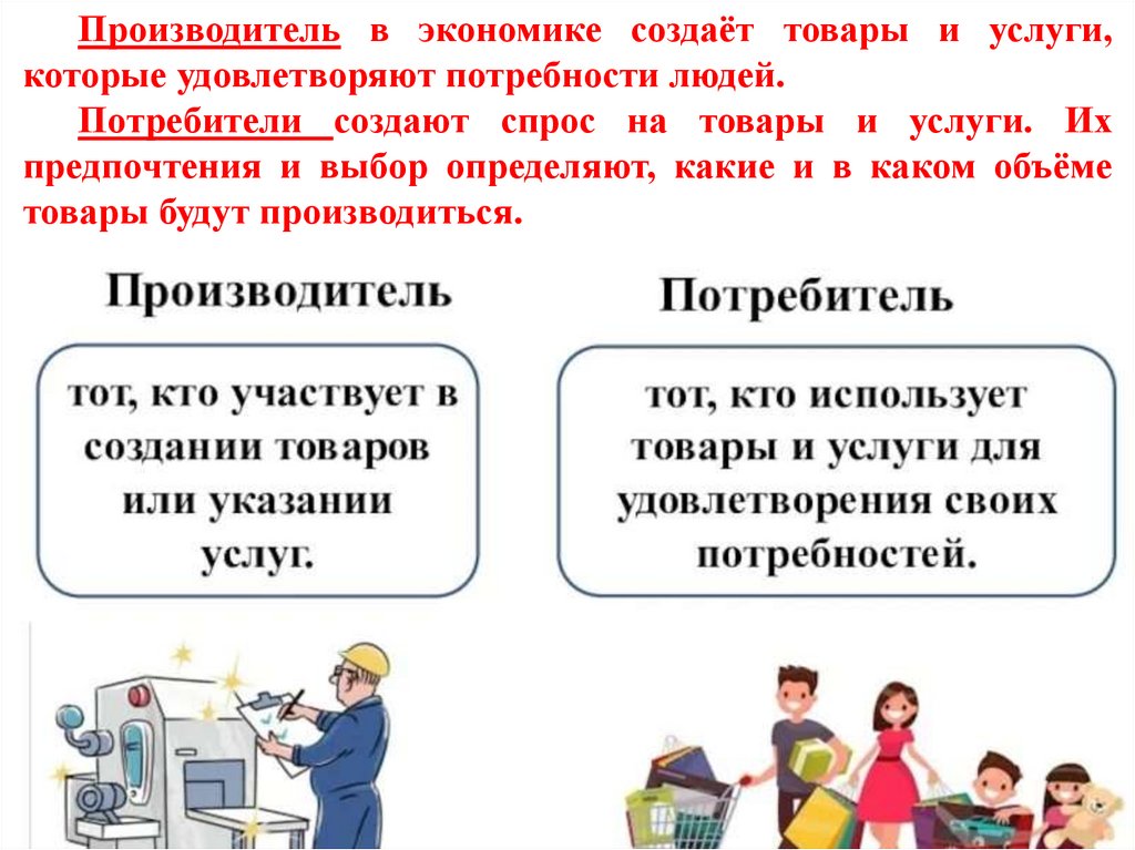 Производитель в экономике создаёт товары и услуги,которые удовлетворяют потребности людей.