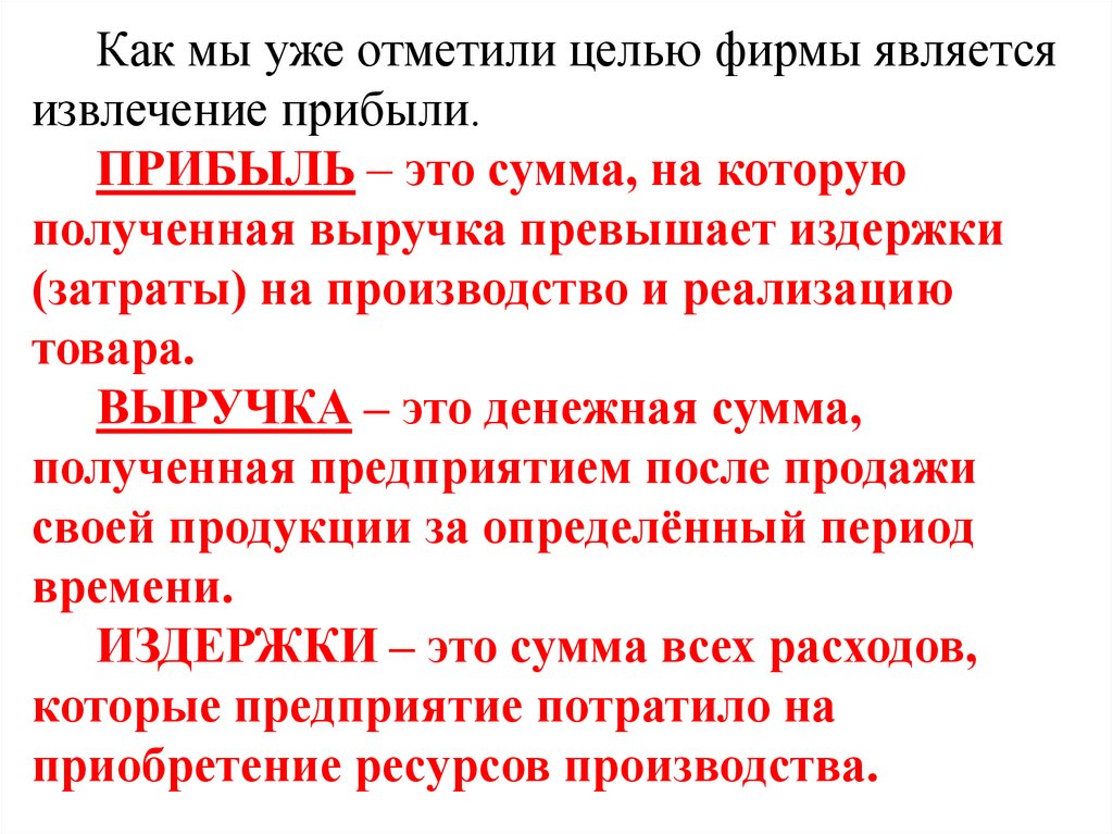 Как мы уже отметили целью фирмы являетсяизвлечение прибыли.