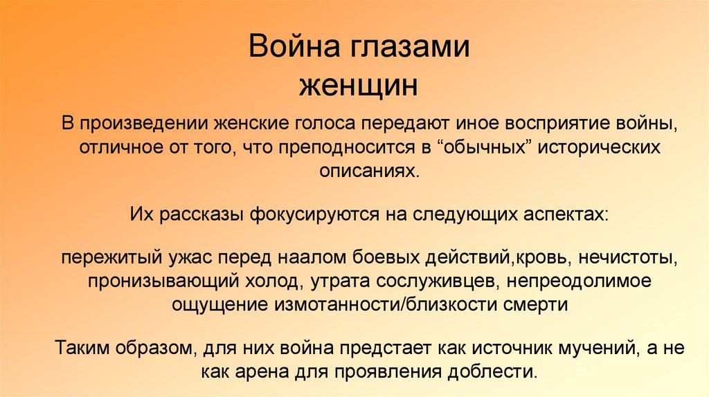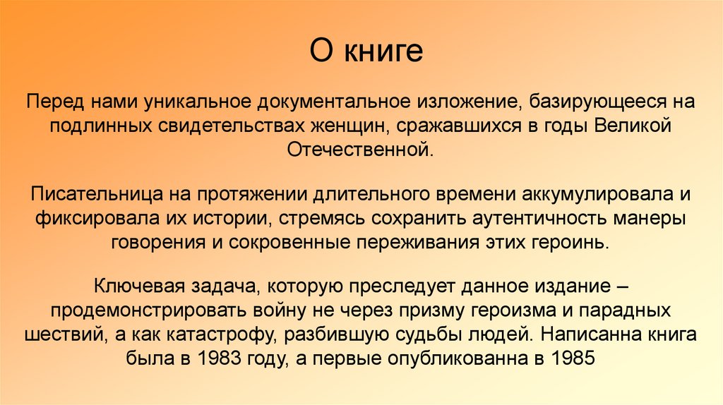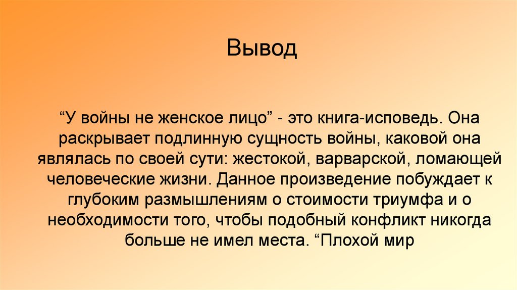 Вывод“У войны не женское лицо” - это книга-исповедь. Она