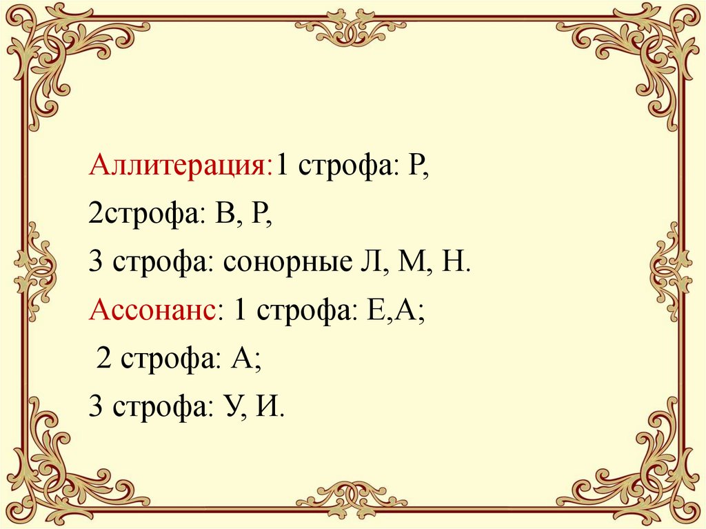 Аллитерация:1 строфа: Р,2строфа: В, Р,