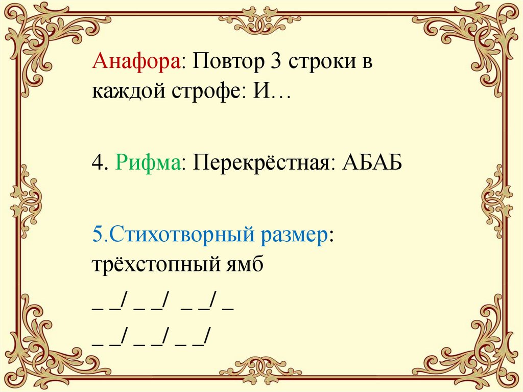 Анафора: Повтор 3 строки вкаждой строфе: И…