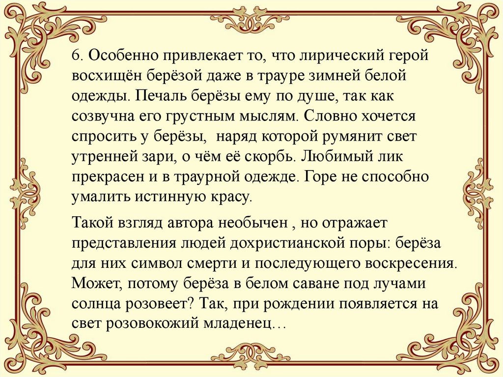 6. Особенно привлекает то, что лирический геройвосхищён берёзой даже в трауре зимней белой