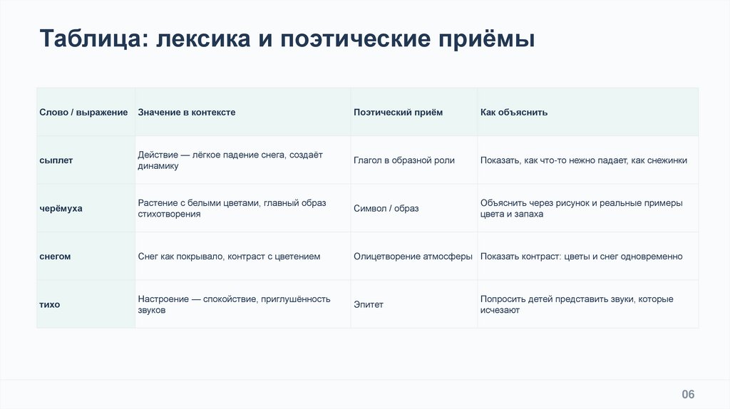 Таблица: лексика и поэтические приёмыСлово / выражение