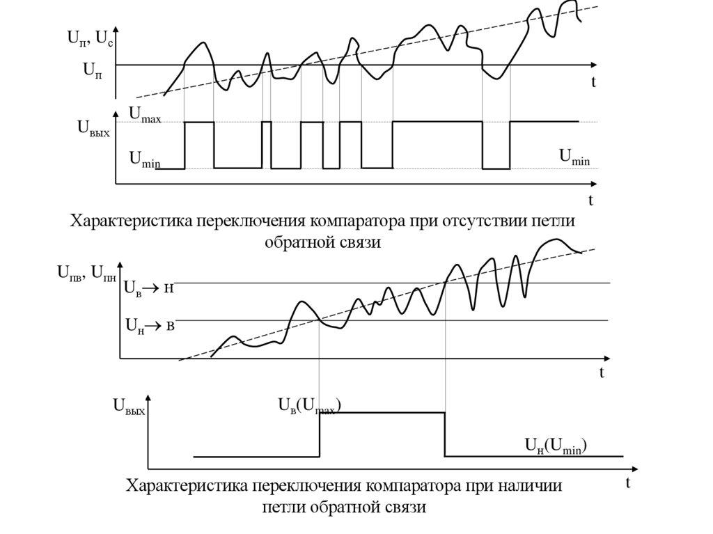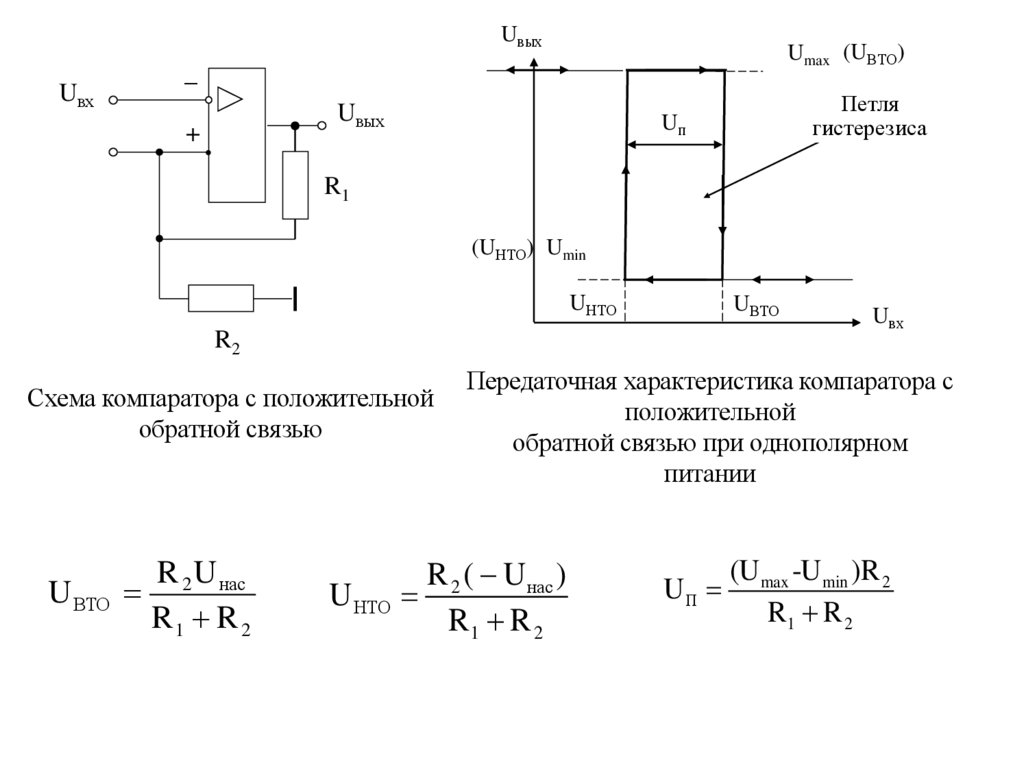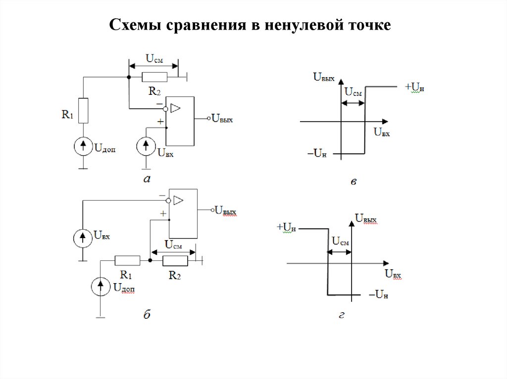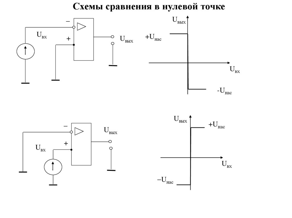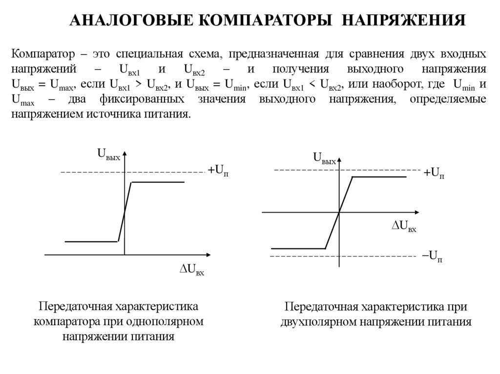 Uвых = Umах, если Uвх1 > Uвх2, и Uвых = Umin, если Uвх1 < Uвх2, или наоборот, где Umin и