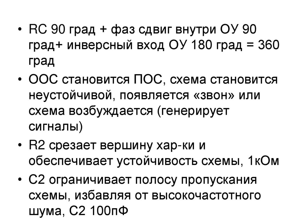 • RC 90 град + фаз сдвиг внутри ОУ 90град+ инверсный вход ОУ 180 град = 360
