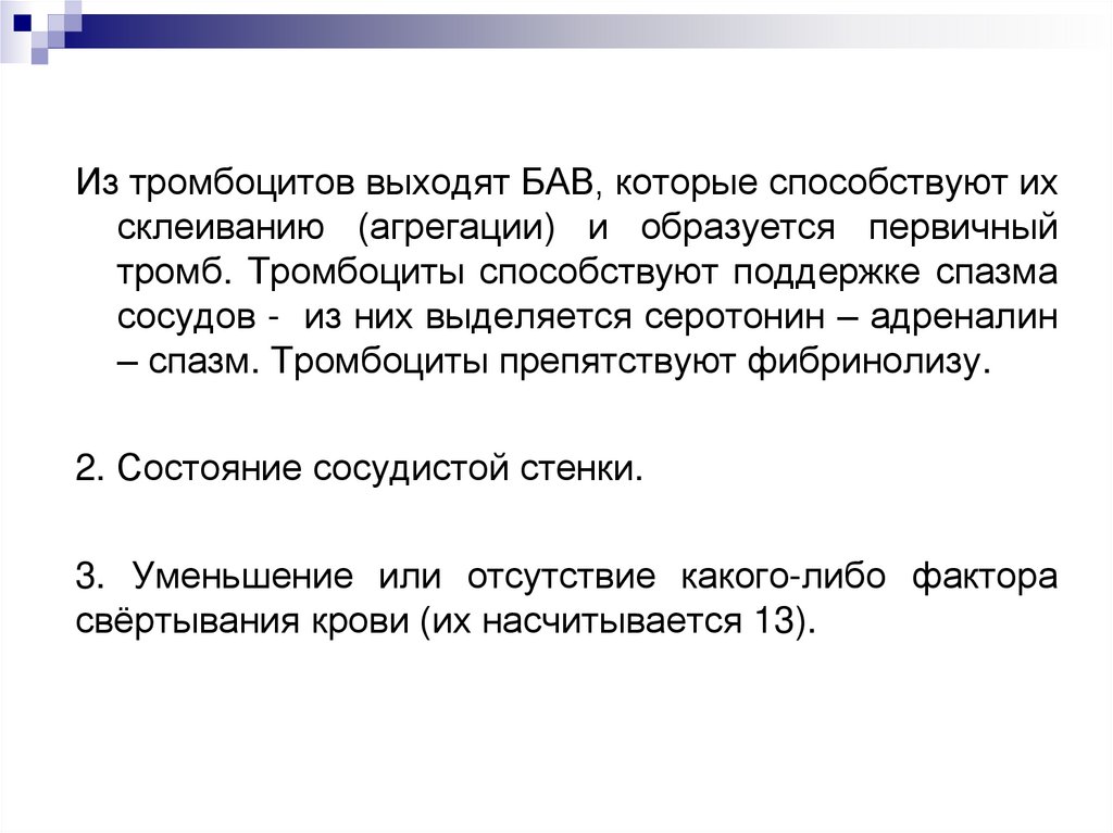 – спазм. Тромбоциты препятствуют фибринолизу.