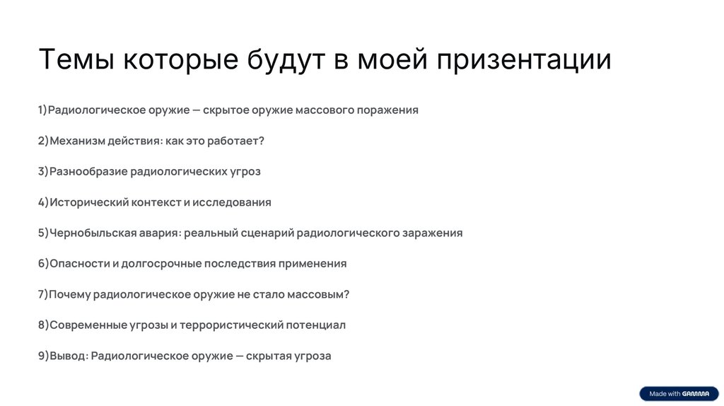 Темы которые будут в моей призентации1)Радиологическое оружие — скрытое оружие массового поражения