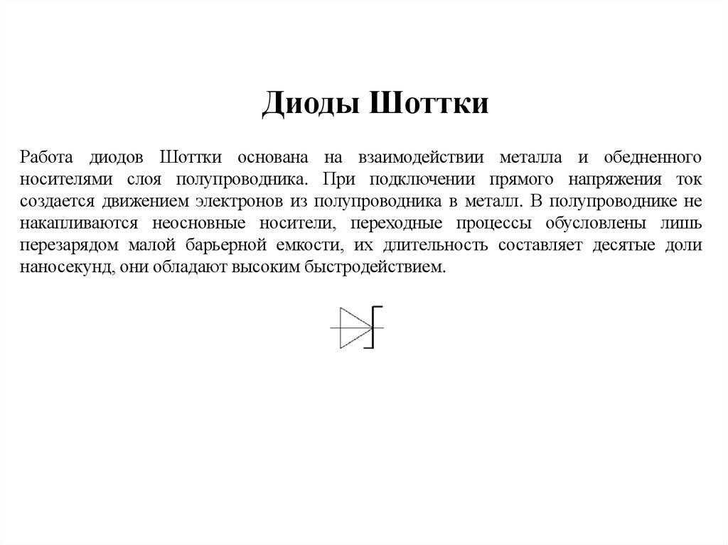 Диоды ШотткиРабота диодов Шоттки основана на взаимодействии металла и обедненного