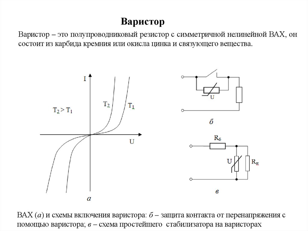 ВАХ (а) и схемы включения варистора: б – защита контакта от перенапряжения с