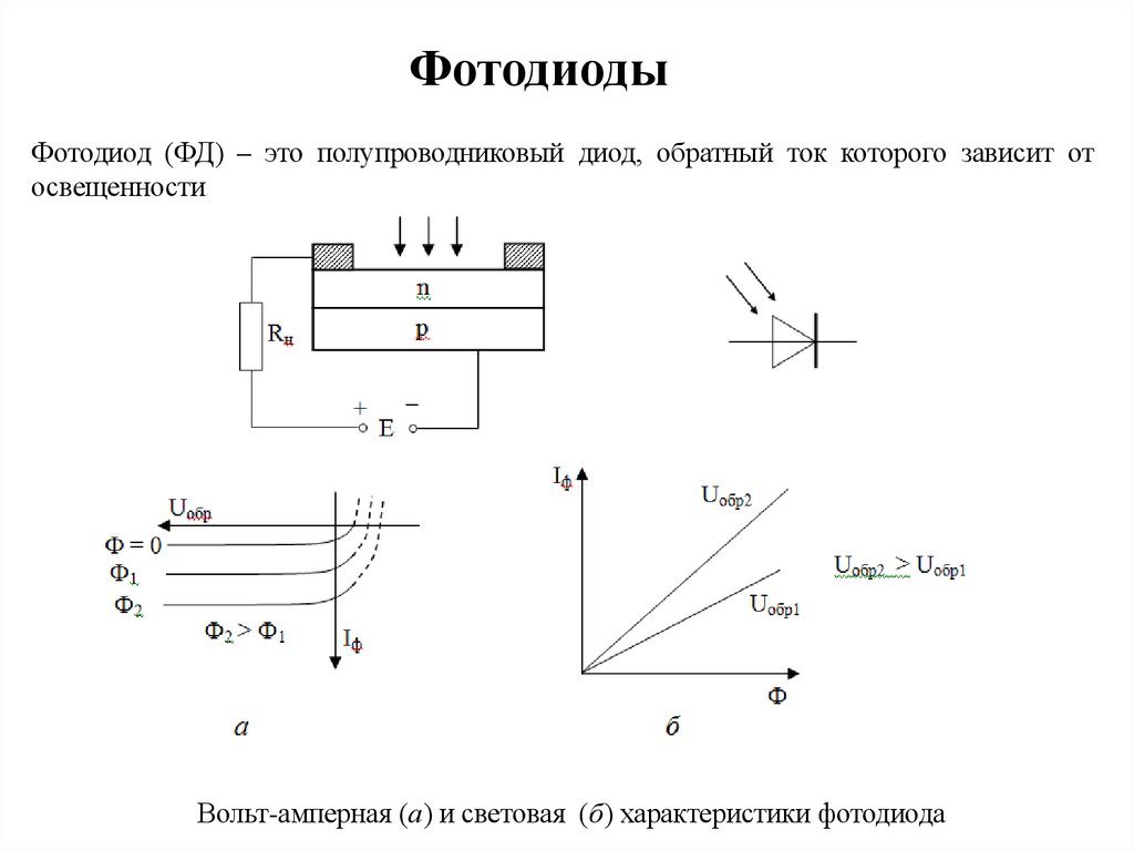 Вольт-амперная (а) и световая (б) характеристики фотодиода