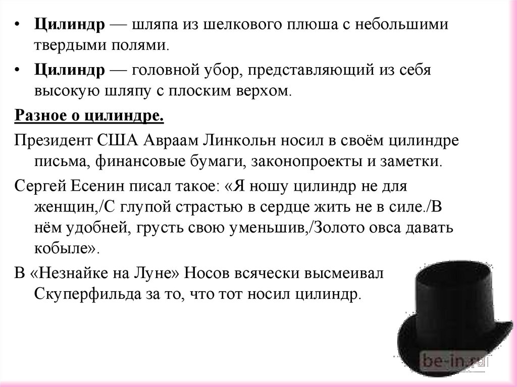 • Цилиндр — головной убор, представляющий из себя
