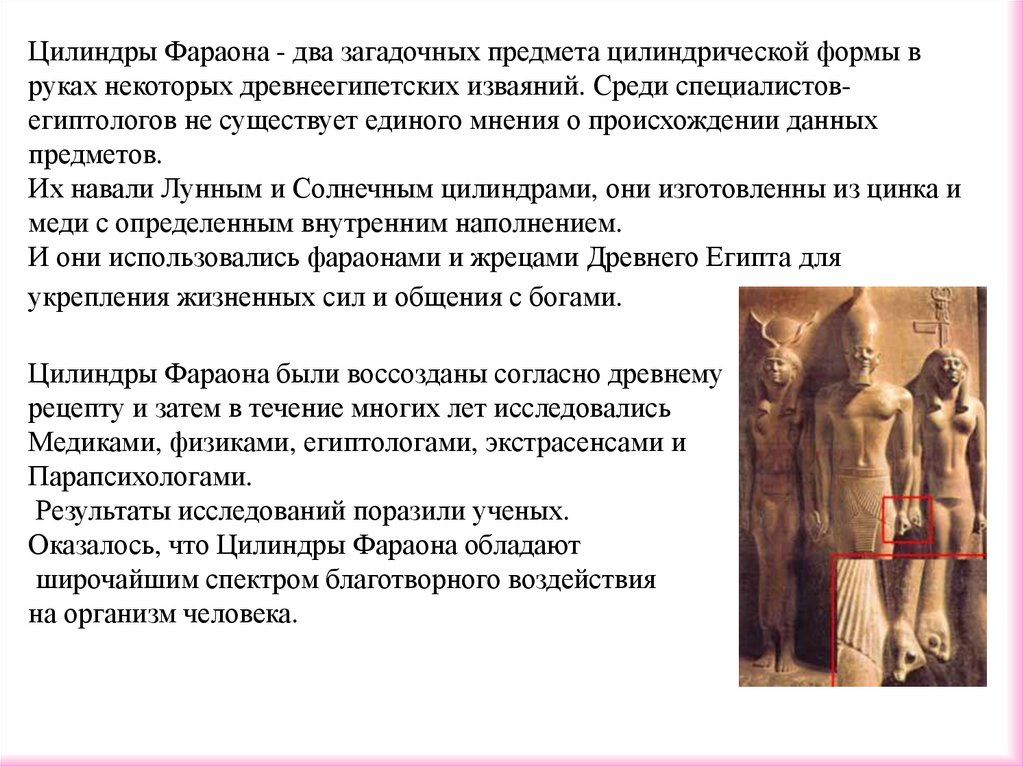 Цилиндры Фараона - два загадочных предмета цилиндрической формы вруках некоторых древнеегипетских изваяний. Среди специалистовегиптологов не существует единого мнения о происхождении данных