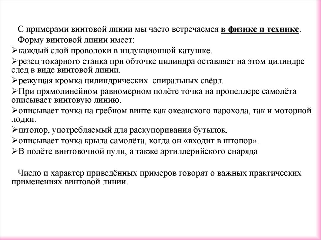 С примерами винтовой линии мы часто встречаемся в физике и технике.Форму винтовой линии имеет: