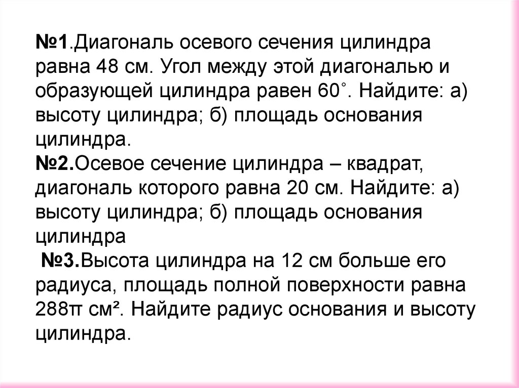 №1.Диагональ осевого сечения цилиндраравна 48 см. Угол между этой диагональю и