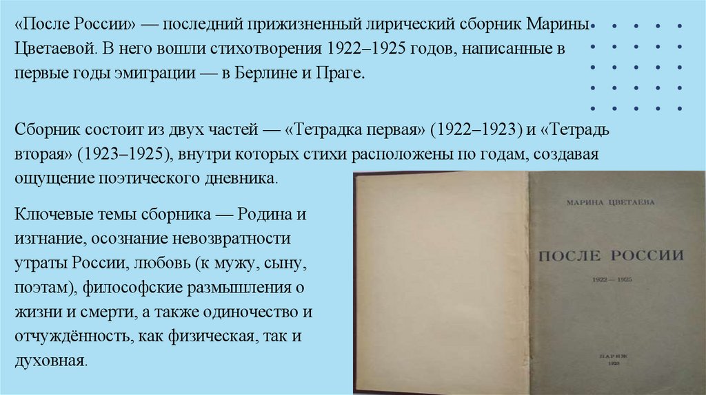 «После России» — последний прижизненный лирический сборник МариныЦветаевой. В него вошли стихотворения 1922–1925 годов, написанные в