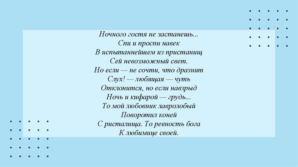 14. Тихонько Рукой осторожной и тонкой Распутаю путы: Ручонки — и ржанью Послушная, зашелестит амазонка По звонким, пустым ступеням